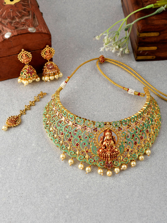 Gold Plated Red Green Stone Laxmi Jewelry Set