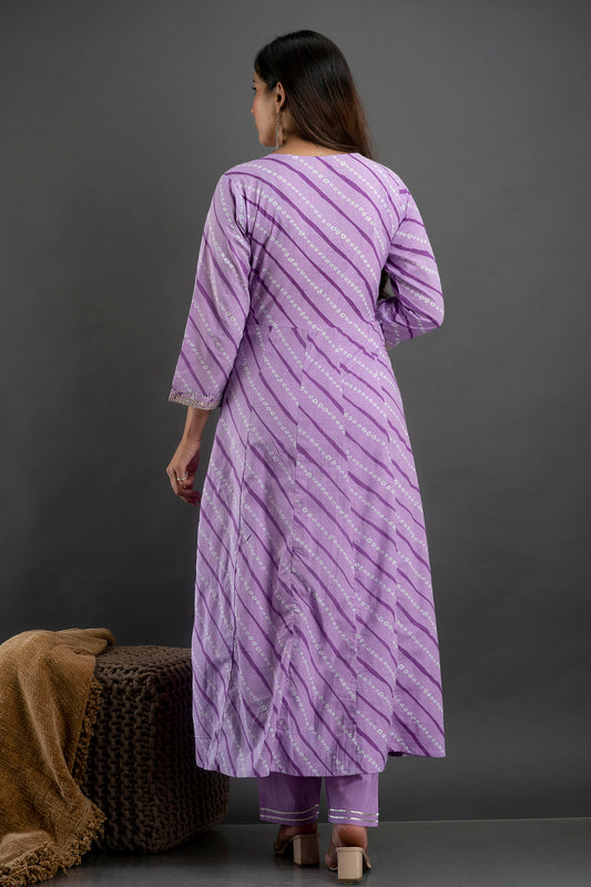 Purple Lehriya Anarkali Heavy work Kurta with trousers and Dupatta kurta set