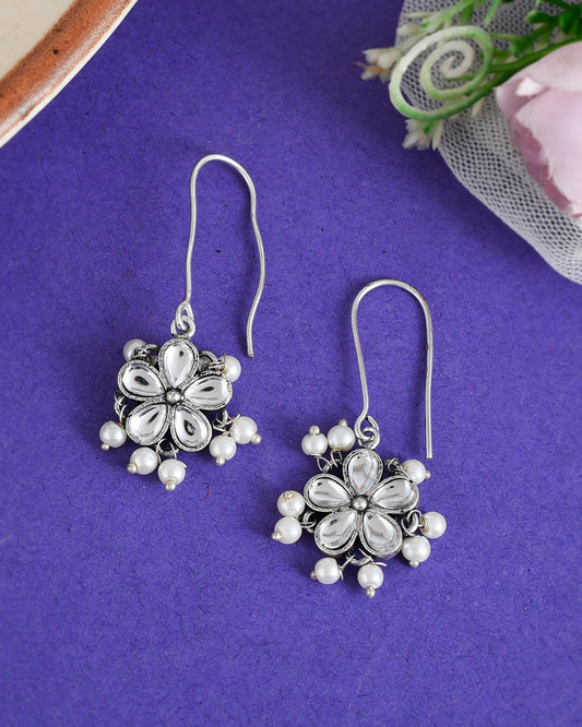 Silver Plated Brown Stone Studded Floral Oxidised Stud Earrings
