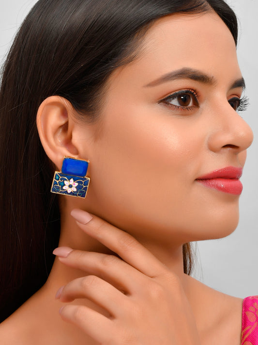 Gold Plated & Green Stone Studded Square Shape Meenakari Stud Earrings