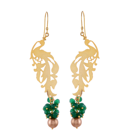 Gold Plated Sterling Silver Peacock Earrings with Green Onyx and Freshwater Pearls