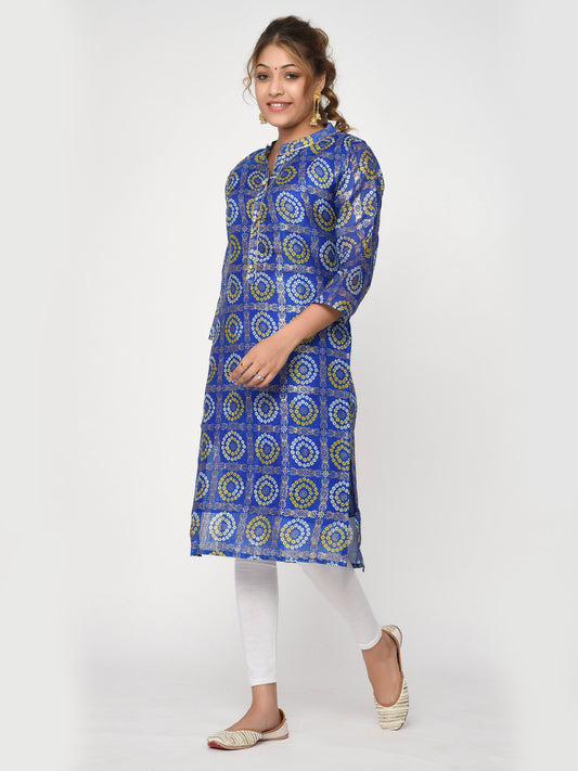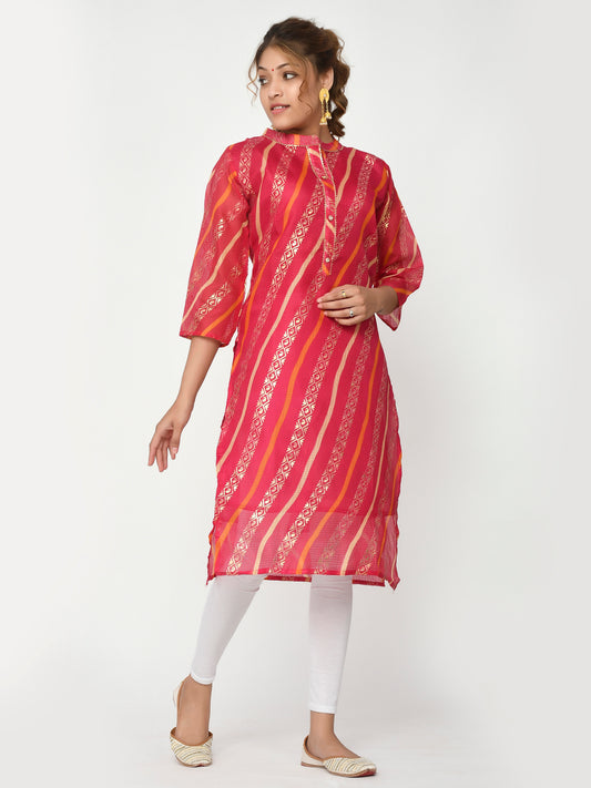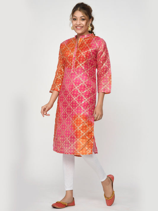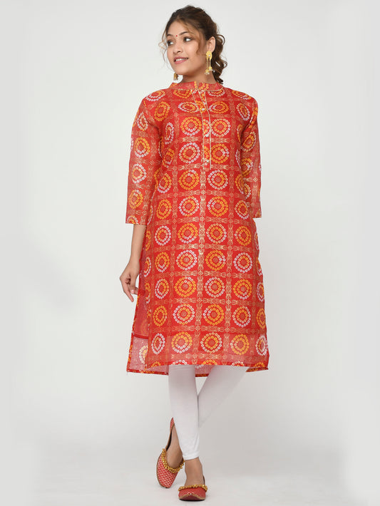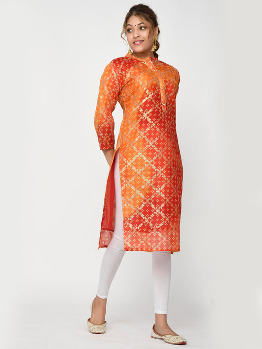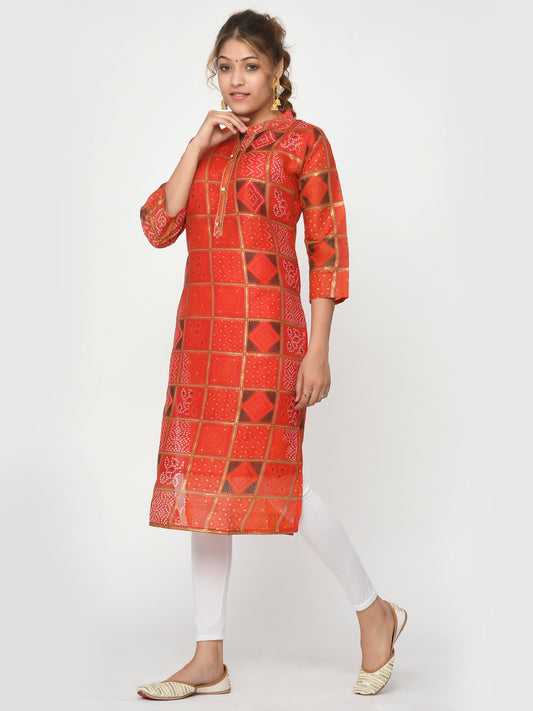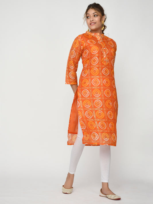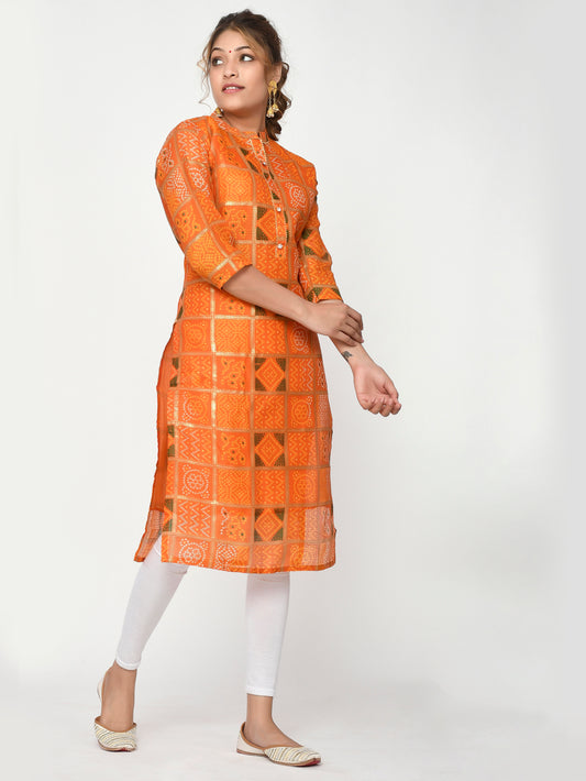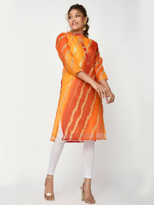 Women Orange & Gold Leheriya Straight Devina Kurta