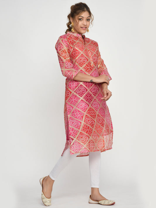 Women Pink & Yellow Chunari Bandhej Straight Ayla Kurta