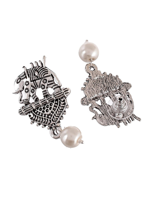 Silver Plated Pearl Drop Oxidized Elephant Earrings For Women