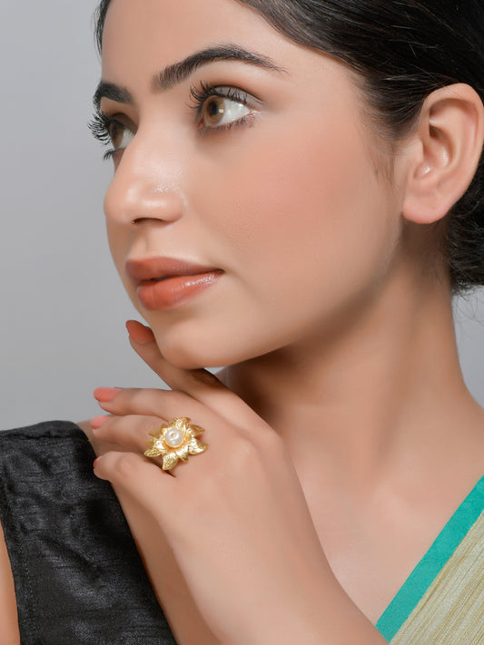 Gold Plated Handcrafted Floral Pearl Bead Finger Ring