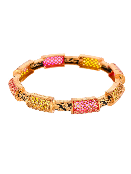 Experience the creativity of traditional Indian style with our gold plated Meenakari bangles featuring colorful and detailed designs which make them an attractive jewellery to pair with traditional outfits.