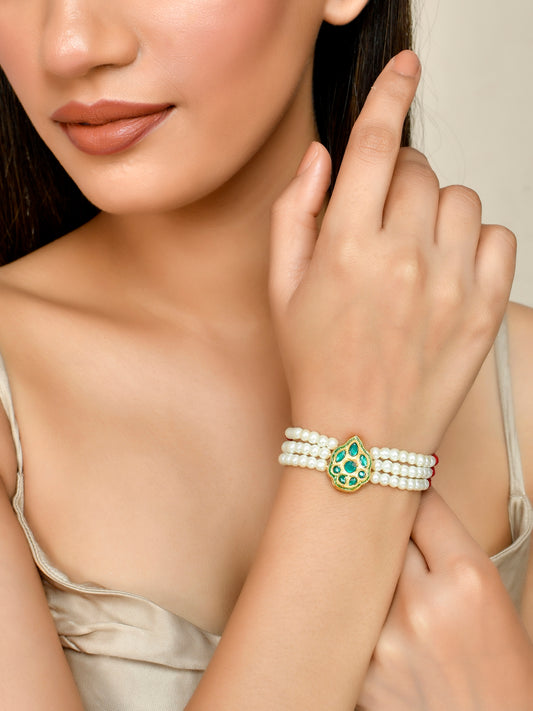 Kundan gold plated bracelet for ladies are trendy with brides and guests on official occasions because of the high quality materials and royal design of Kundan jewellery. These bracelets combine glass or gemstones set in detailed designs that reflect the light beautifully with gold plating.