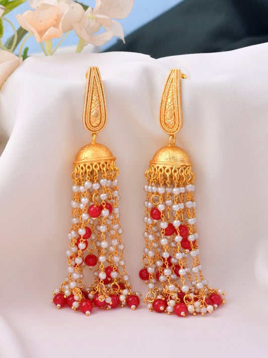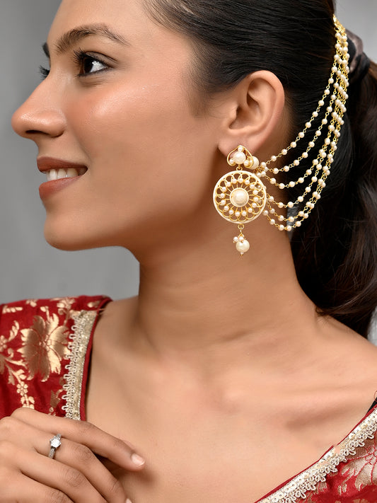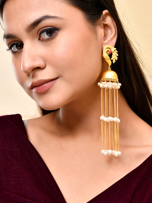 Gold-Plated Jhumka Earrings With Long Pearls Chain