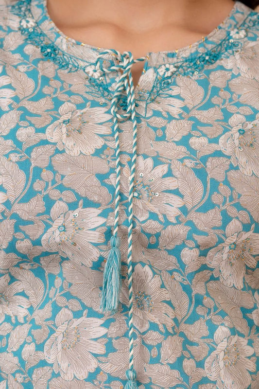 Hand Embroidered Sequence Pure Cotton Blue Kurta With Trousers & Dupatta