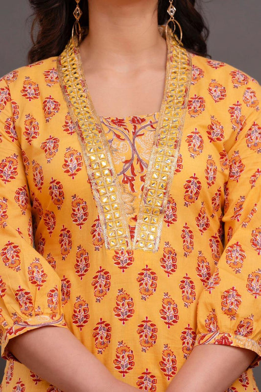Mirror Work Embroidery Pure Cotton Mustard Kurta With Trousers & Dupatta