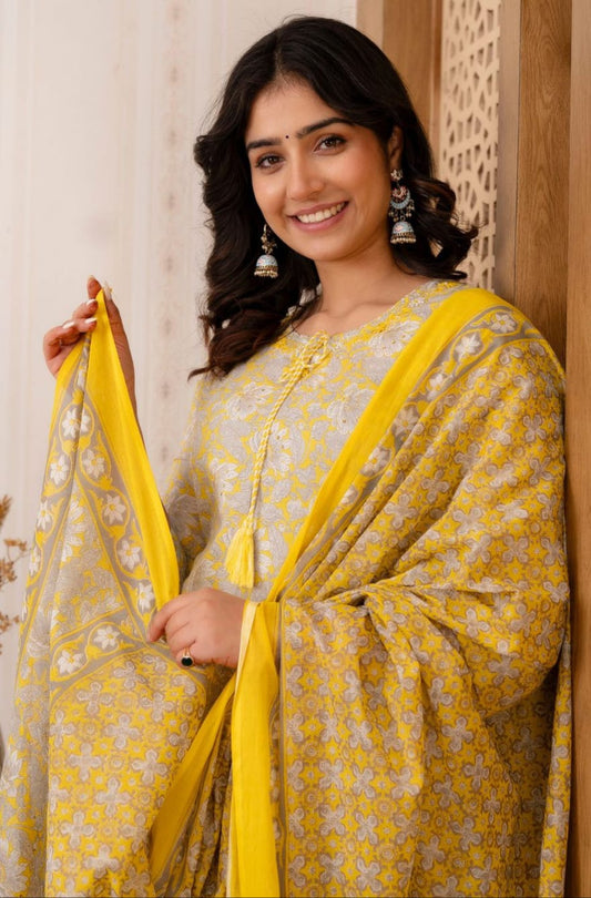 Hand Embroidery Pure Cotton Yellow Kurta With Trousers & Dupatta