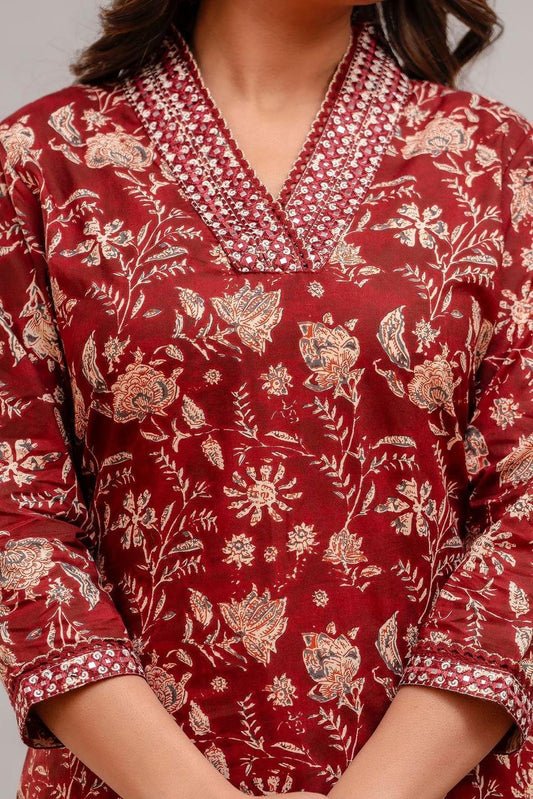 Hand Embroidered Sequence Pure Cotton Maroon Kurta With Trousers & Dupatta