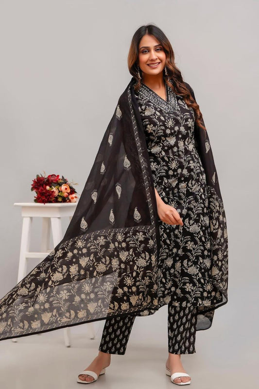 Hand Embroidered Sequence Pure Cotton Black Kurta With Trousers & Dupatta