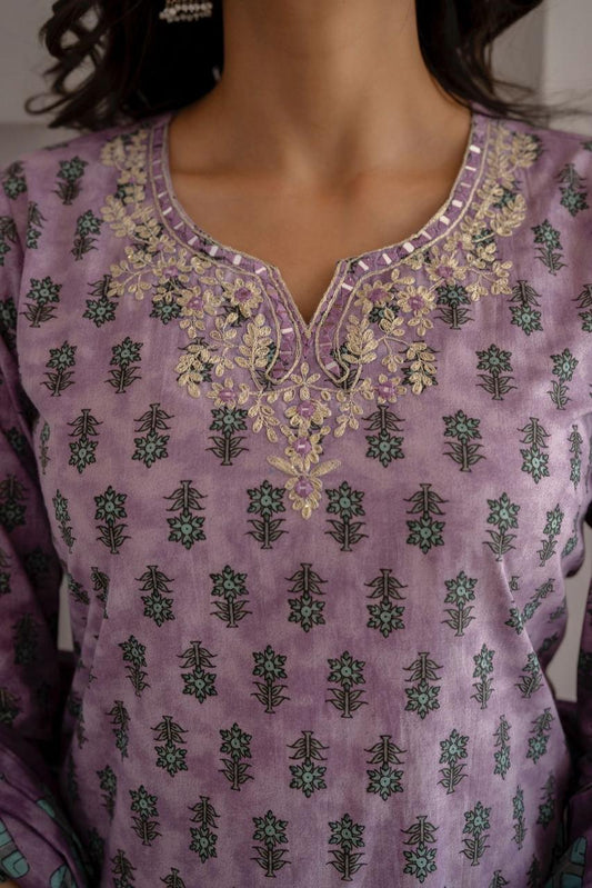 Hand Embroidered Sequence Cotton Purple Kurta With Trousers & Dupatta