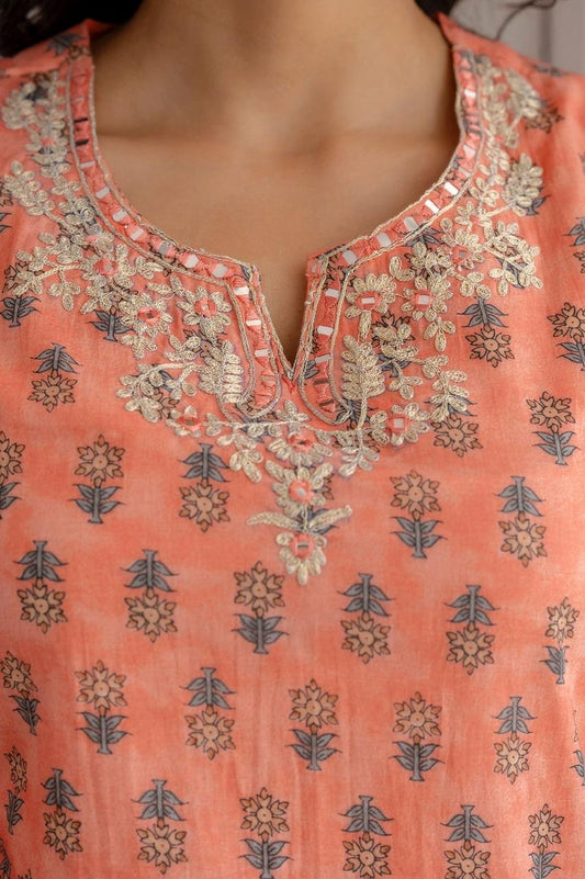 Hand Embroidered Sequence Pure Cotton Peach Kurta With Trousers & Dupatta