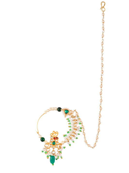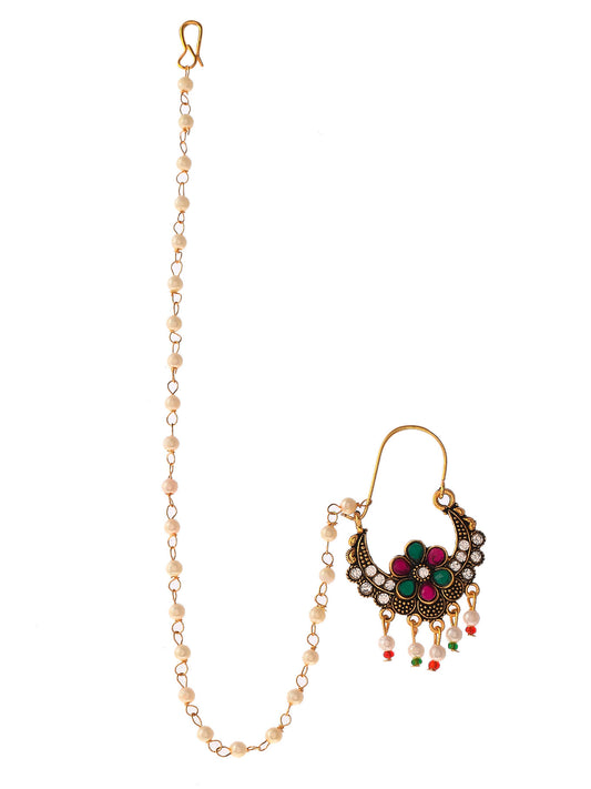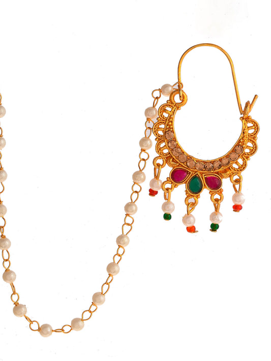 Gold Plated Kundan Hand Painted Pearl Chained Nose Ring