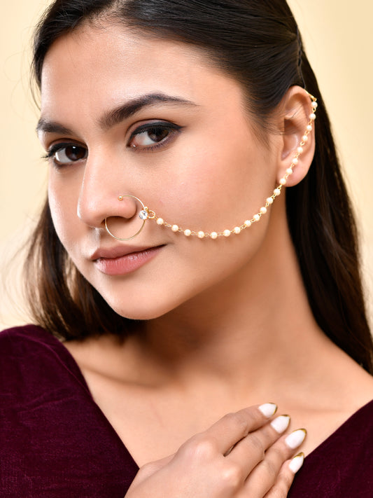 Gold Nosepin With Pearl Chain and Crystal Nose Pin