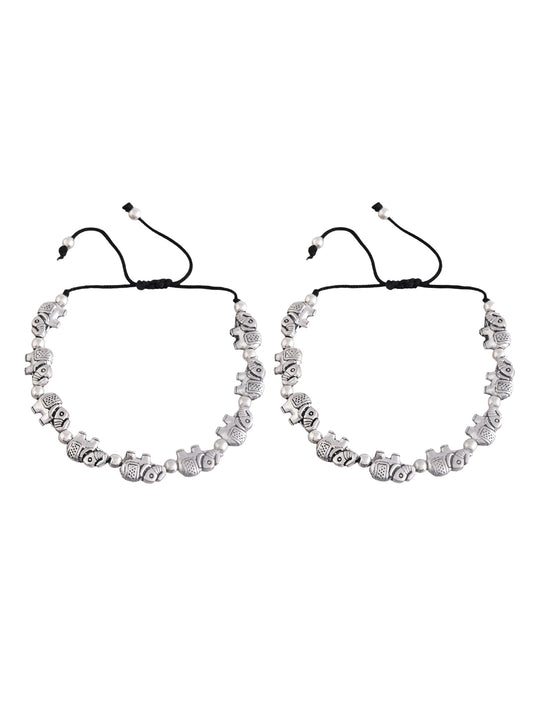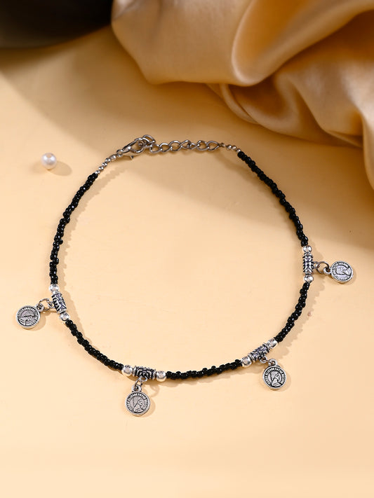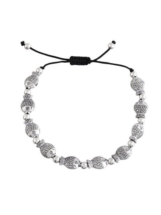 Silver- Plated Fish & Beads Black Thread Anklet For Women