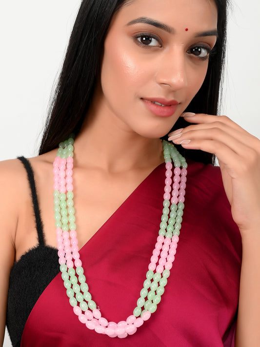 Unisex Gold Toned Pink Green Long Layered Necklace