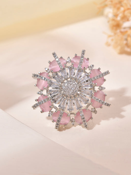 Pink American Diamond & Silver Plated Cocktail Ring For Women