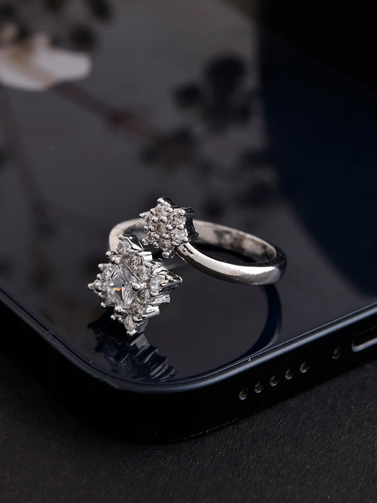 Flower American Dimond Studded Silver-Plated Finger Ring