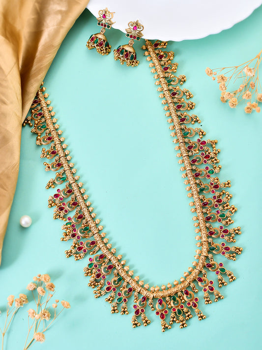 Classical Temple Gold Plated Beads Studded Long Necklace Set With Jhumka Earring