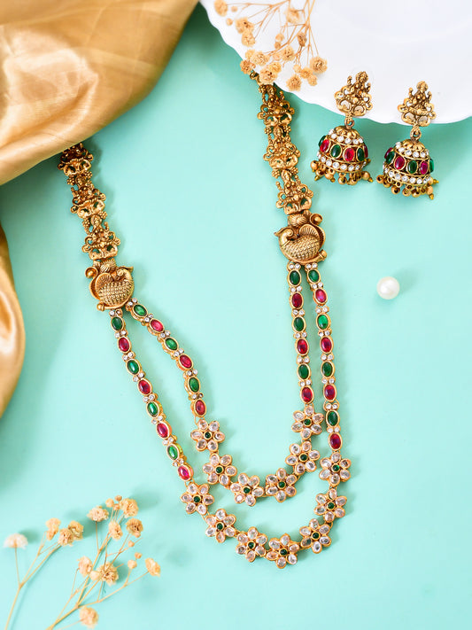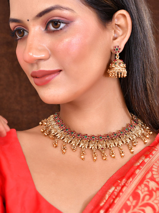 Gold Plated Red & Green Stone Temple Jewellery Set