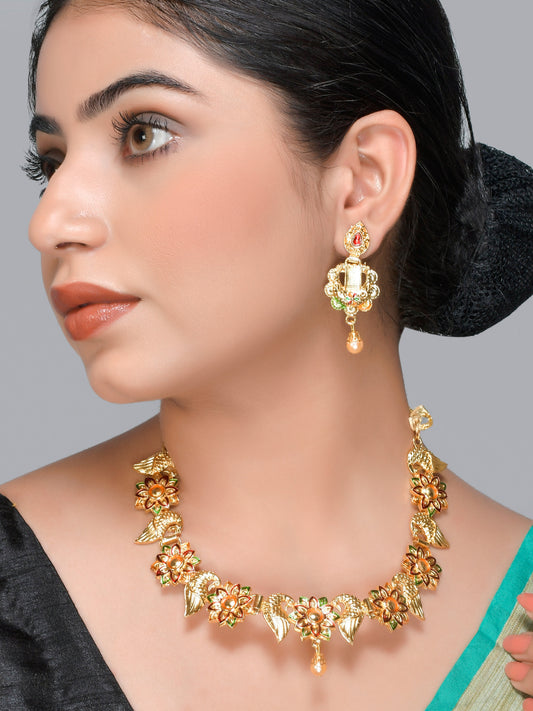 Gold Plated Traditional Temple Jewelry Set | Antique Necklace Set With Earrings