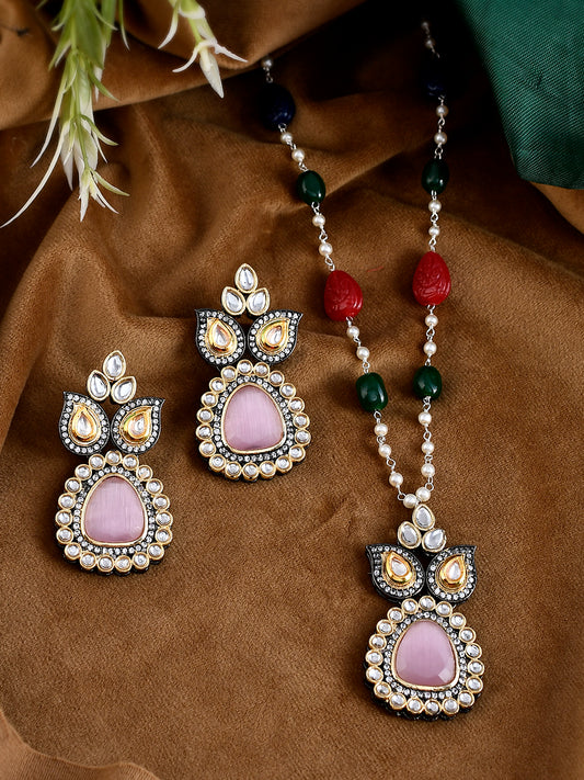 Multicolor Beaded Kundan Necklace Set With Pendant & Matching Earrings For Women