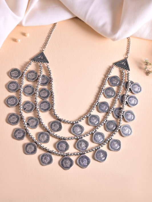 Oxidised Silver Tribal Necklace With Coins Double Side Wear For Women