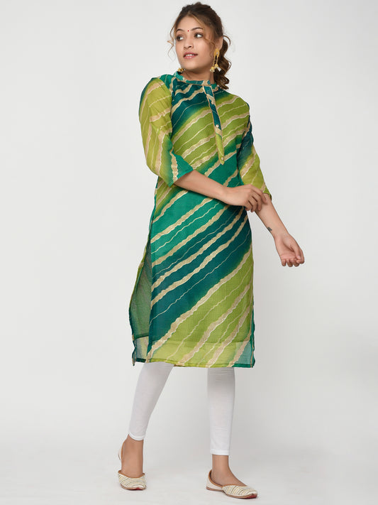 Women Green & Golden Leheriya Printed Straight Aakhya Kurta