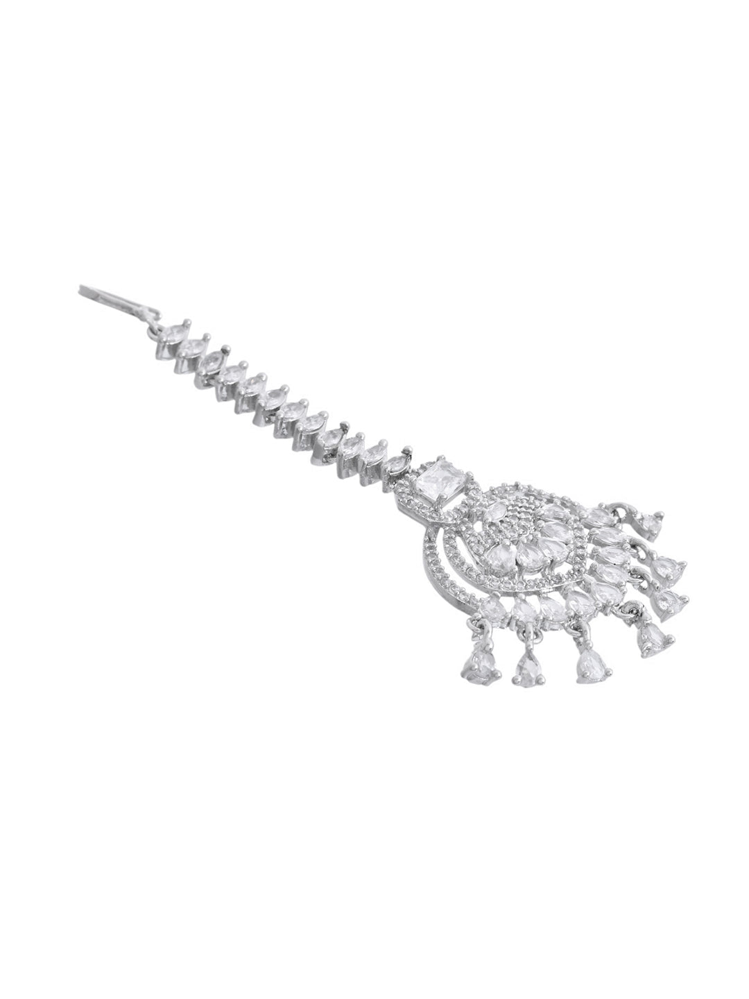 These silver-plated American Diamond statement maangtika combine traditional motifs with modern elegance, making them a must-have for festive and party occasions.