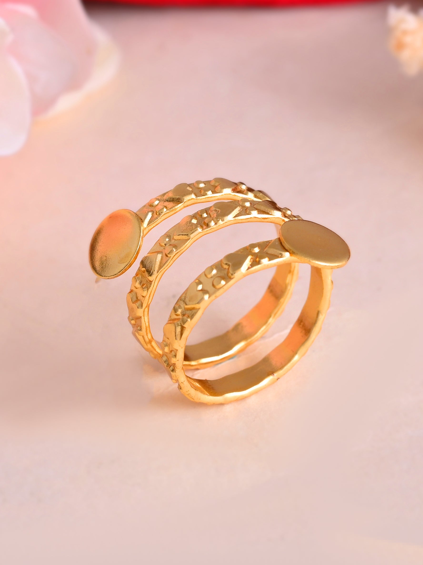 Pair this gold-textured ring with traditional outfits like sarees or kurtas for a polished ethnic look. It also matches perfectly with Western attire, giving your fingers a bold and trendy statement effect. Great for festive events, daily styling, and gifting.