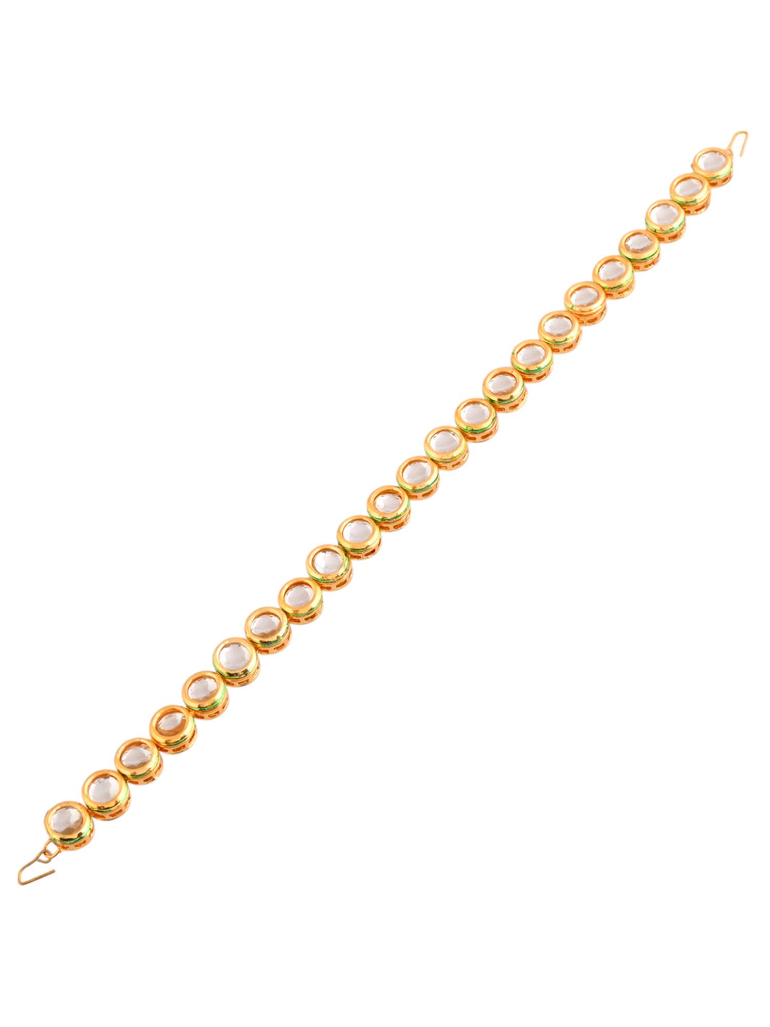 Enhance your bridal charm with the Golden Grace: Pearl Elegance Mathapatti, a stunning fusion of traditional design and modern sophistication. This exquisite headpiece is beautifully crafted with lustrous pearls and finished with radiant gold plating, making it the perfect choice for brides who wish to make a regal statement on their special day. The delicate arrangement of pearls adds a touch of purity and grace, while the intricate gold detailing highlights timeless Indian craftsmanship.