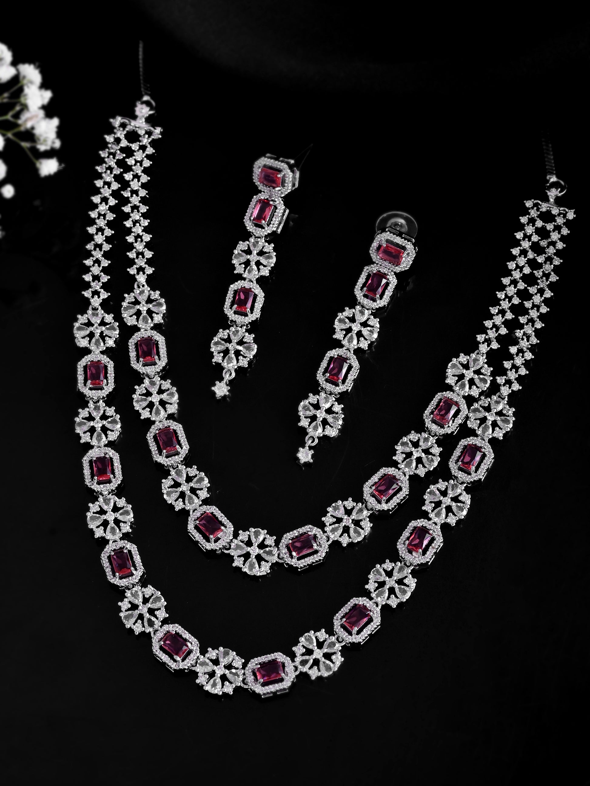 Silver Double Layer Pink American Diamond Set | Wedding Jewellery For Women| Bridal CZ Necklace With Earrings