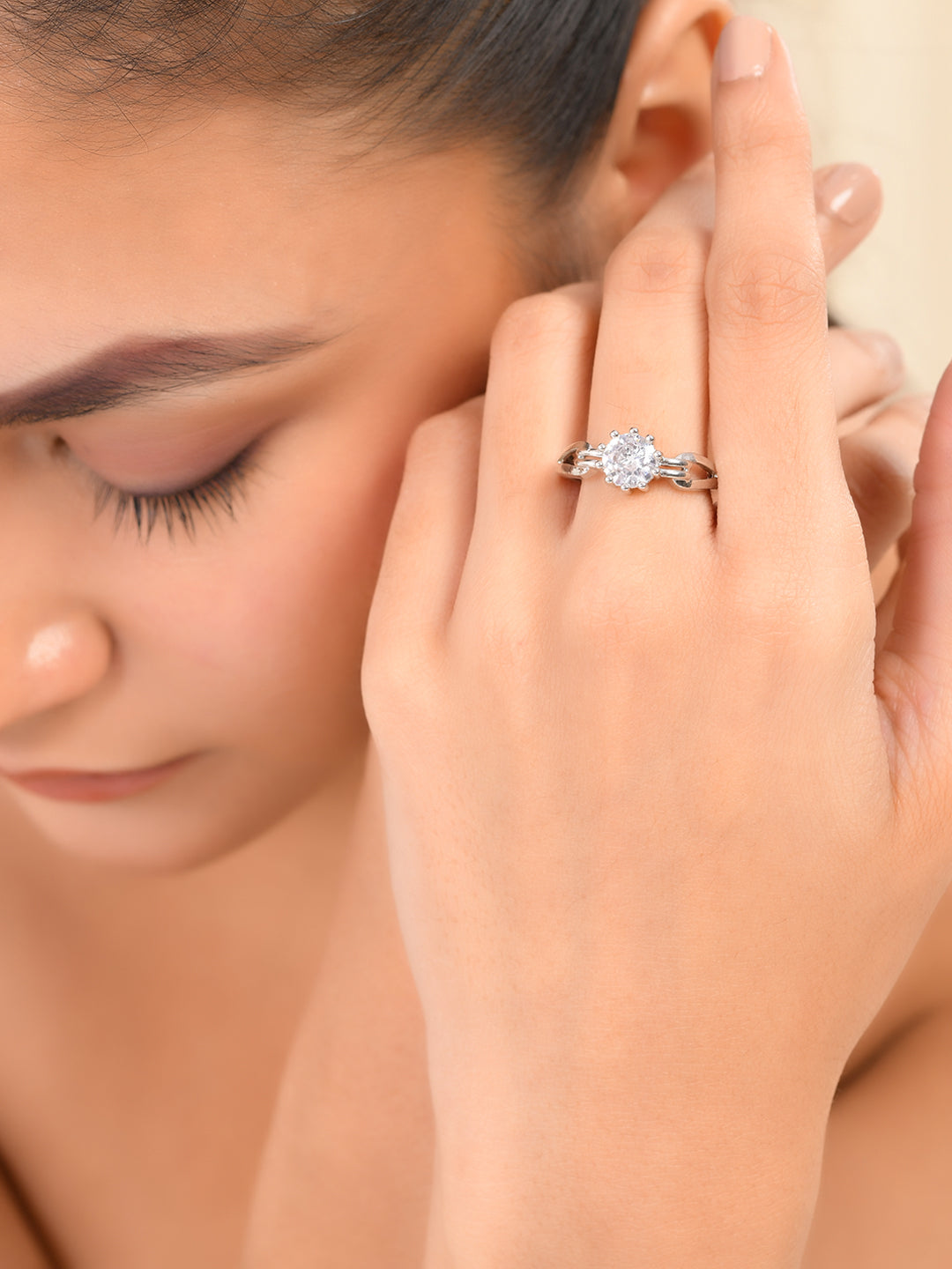 This silver-plated finger ring features a stunning round diamond studded design. With high-quality materials and expert craftsmanship, this ring is sure to impress. Add a touch of elegance and sophistication to any outfit with this beautifully designed piece.