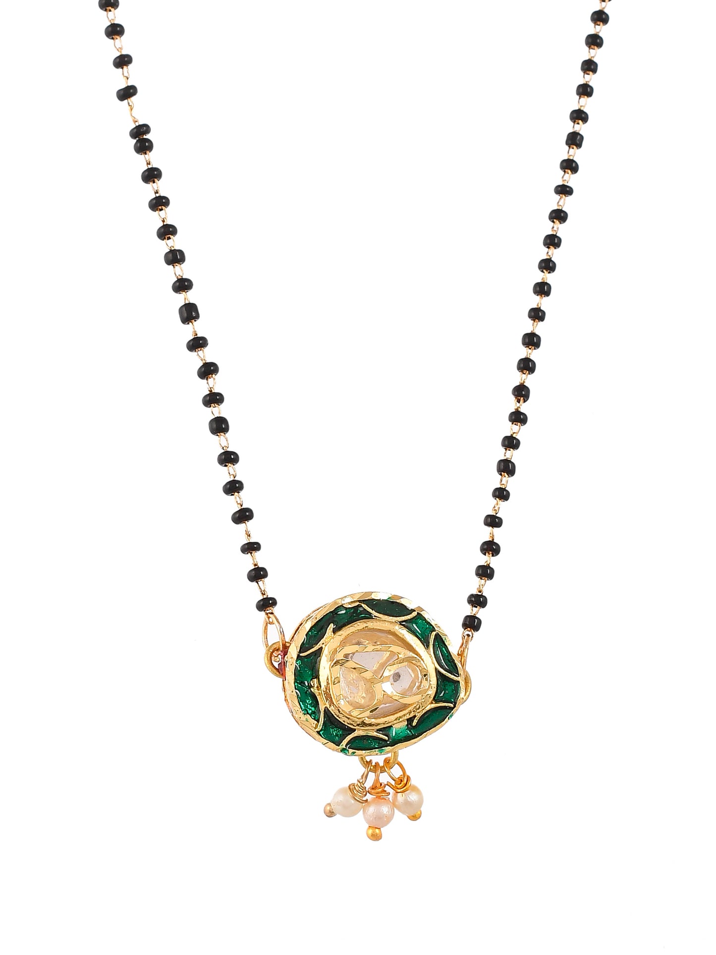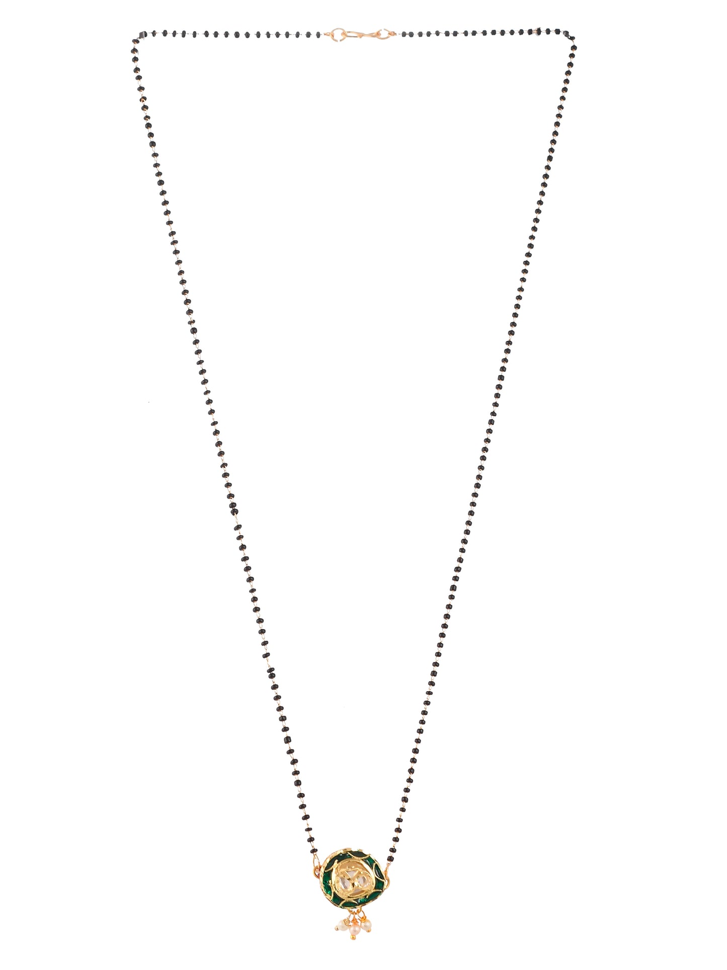 Women Black & Green Gold Plated Kundan Mangalsutra Secured With S-hook Closure Gold-plated, black beaded mangalsutra, has green and white stylized centerpiece, has kundan and beads