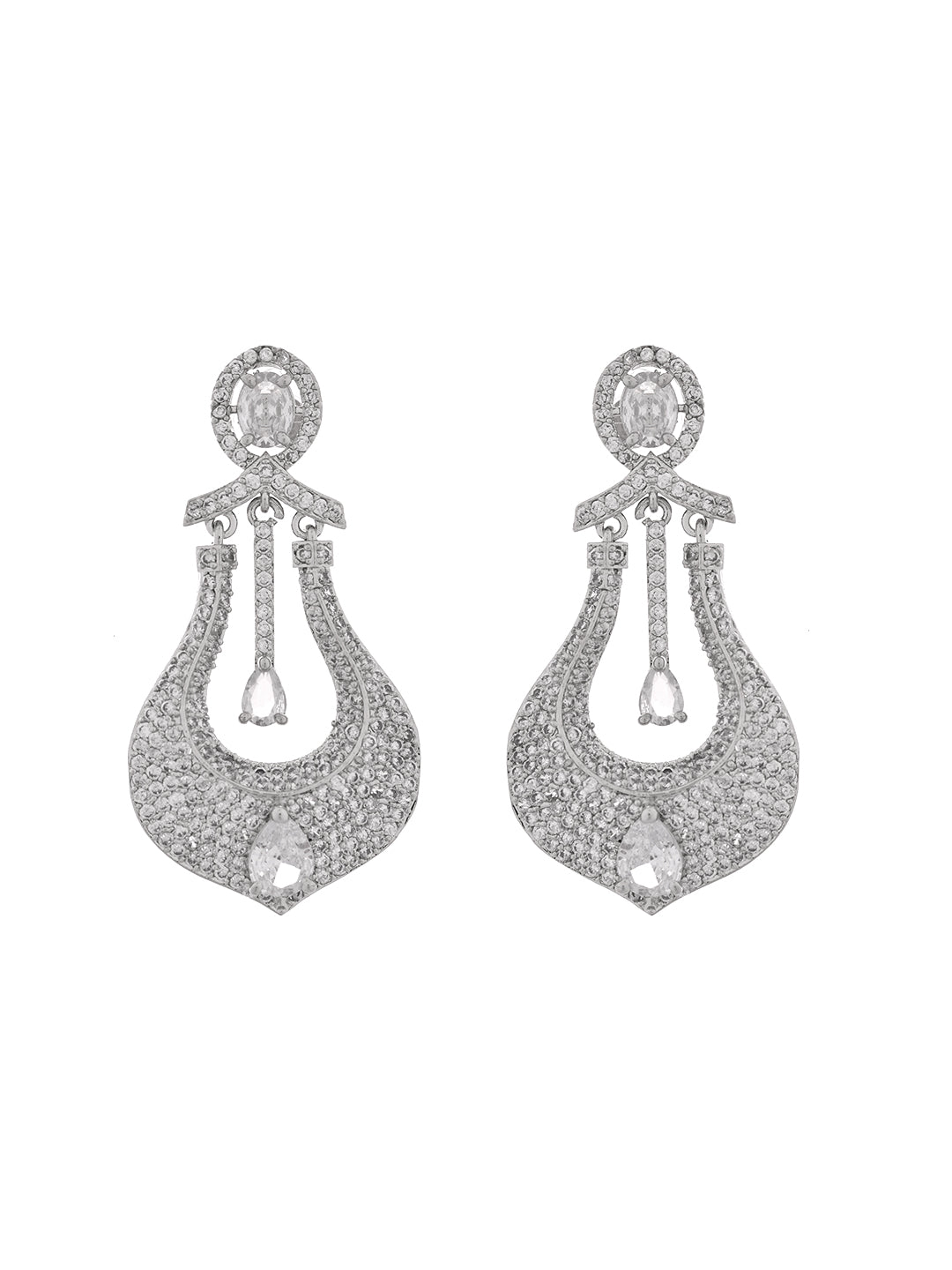 American Diamond drop earrings from Silvermerc Designs. Crafted with high-quality cubic zirconia stones and silver-plated finish, these designer earrings feature a graceful chandelier drop design that adds brilliance to your party, wedding, and festive look.