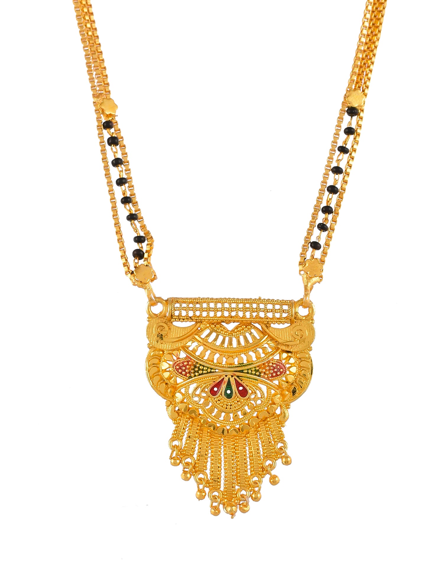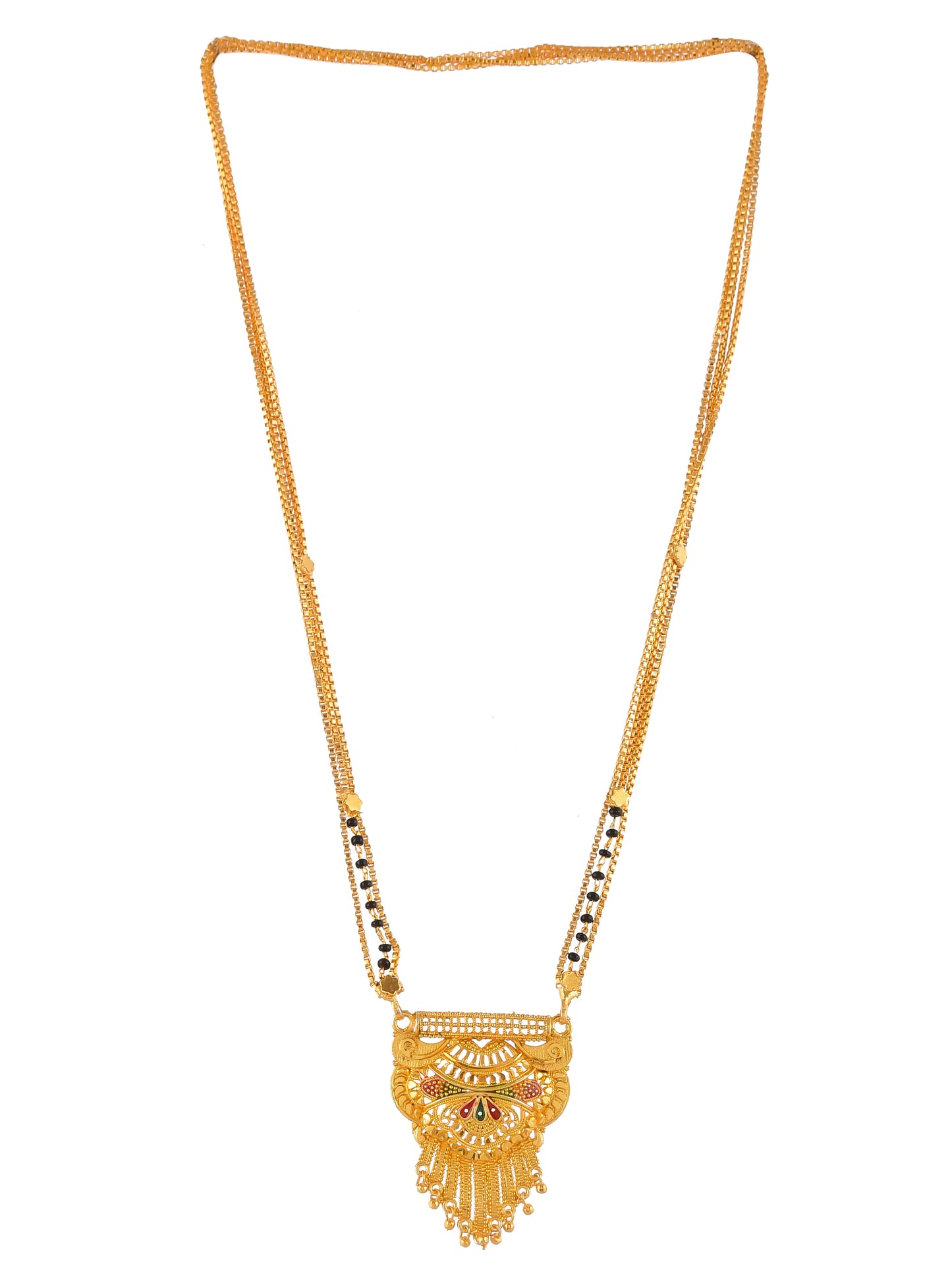 Gold-plated black beaded multi-stranded mangalsutra, has a centerpiece with red Meenakari Mangalsutra detail