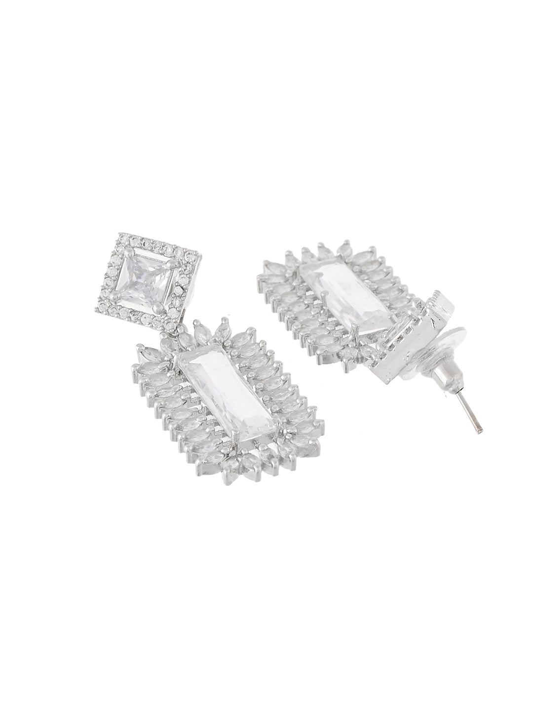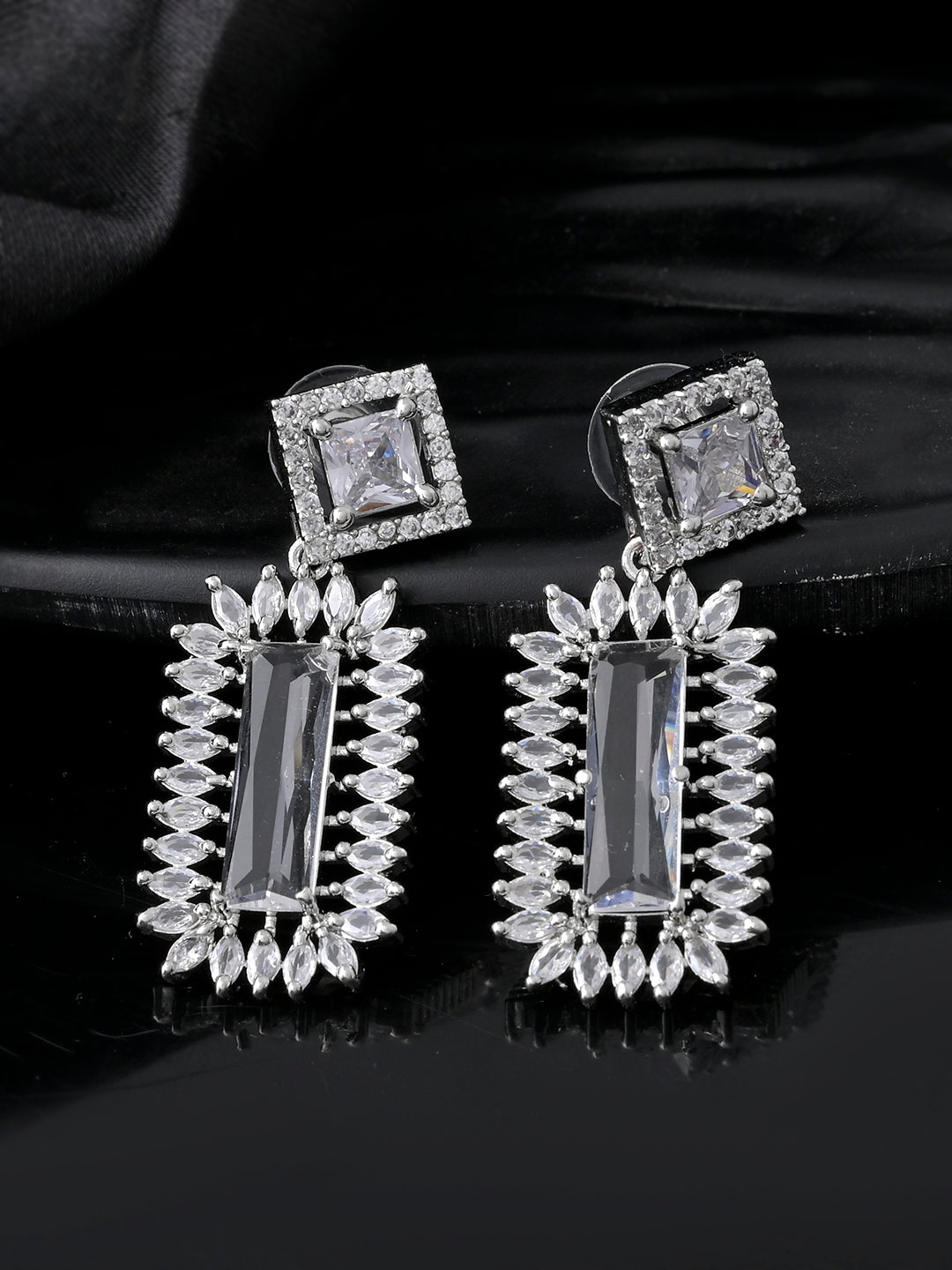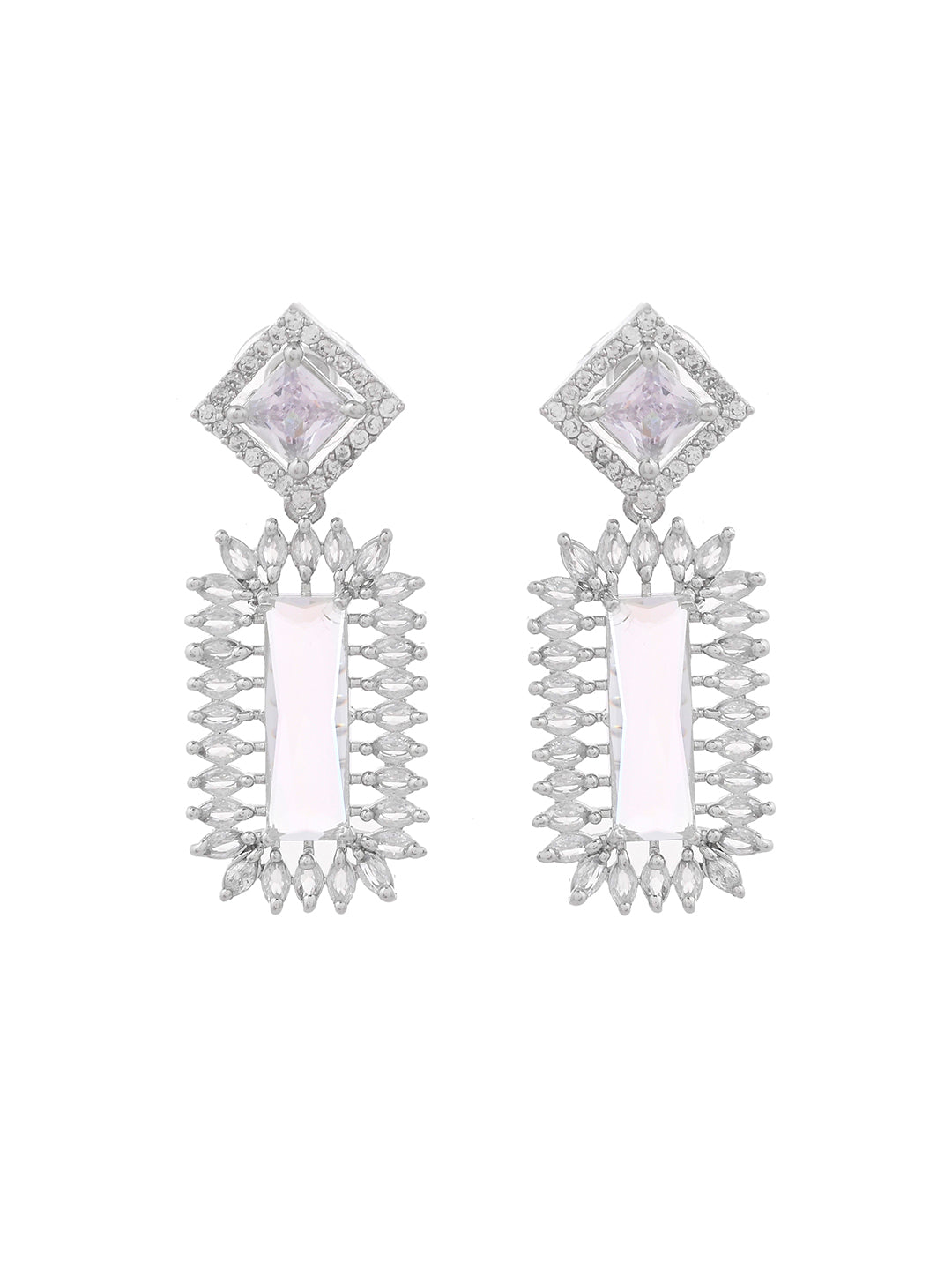 Crafted with precision, each earring showcases a cascading array of round-cut and baguette diamonds, set in high-polish 18K white gold (or silver/rhodium-plated metal, if applicable). Lightweight yet eye-catching, they offer comfortable wear without compromising on glamour. Whether dressing for a black-tie event, wedding, or upscale dinner, these earrings are your go-to piece for timeless luxury.