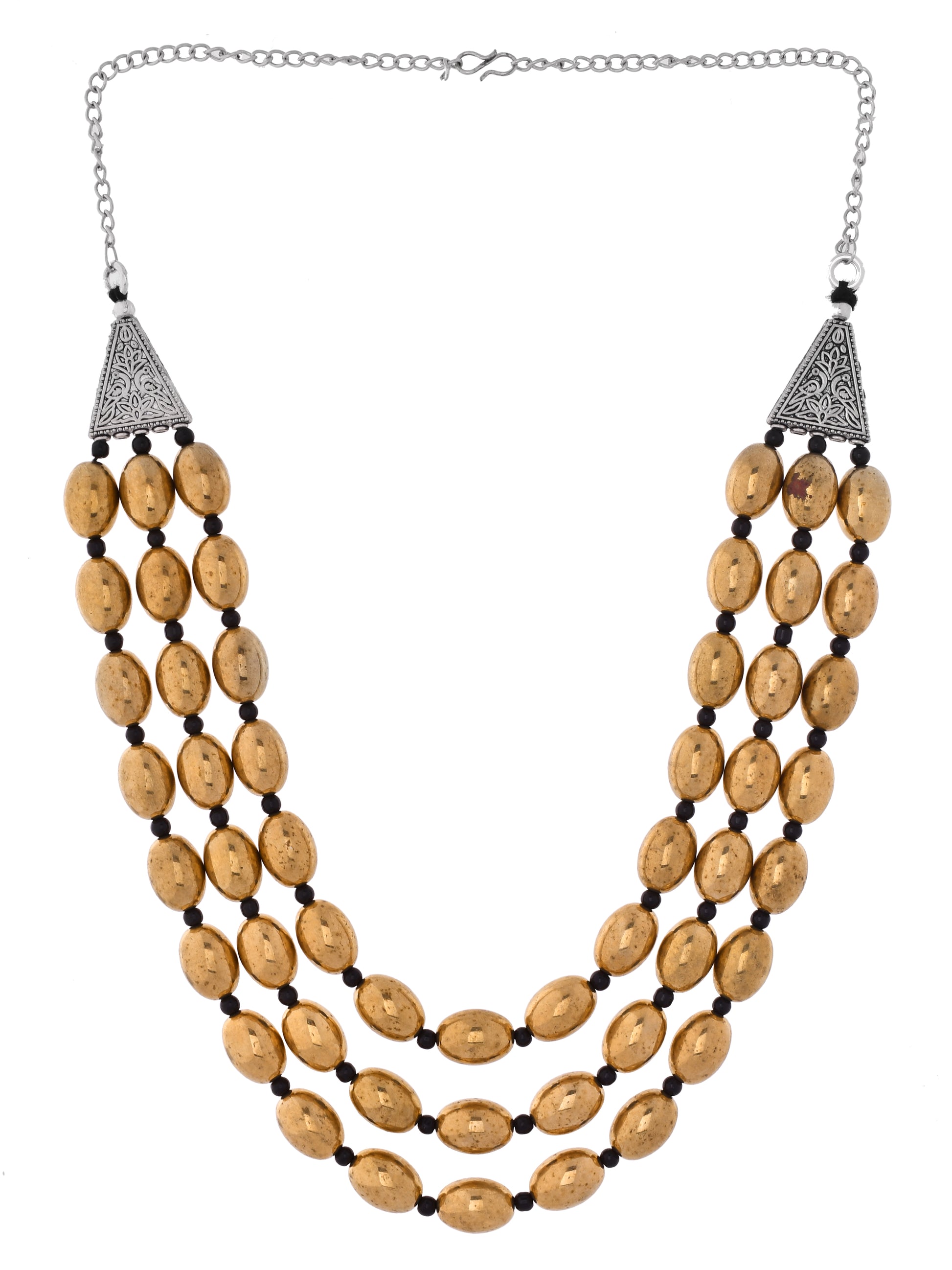 Make a bold ethnic statement with this elegant Golden & Black Layered Beaded Necklace, designed with three stylish layers of metallic gold beads paired with glossy black accents. The oxidised triangle connector adds a traditional charm, giving the necklace a perfect fusion of modern and ethnic aesthetics. Lightweight and beautifully crafted, this piece is ideal for festive wear, Indian functions, office parties, and everyday styling.