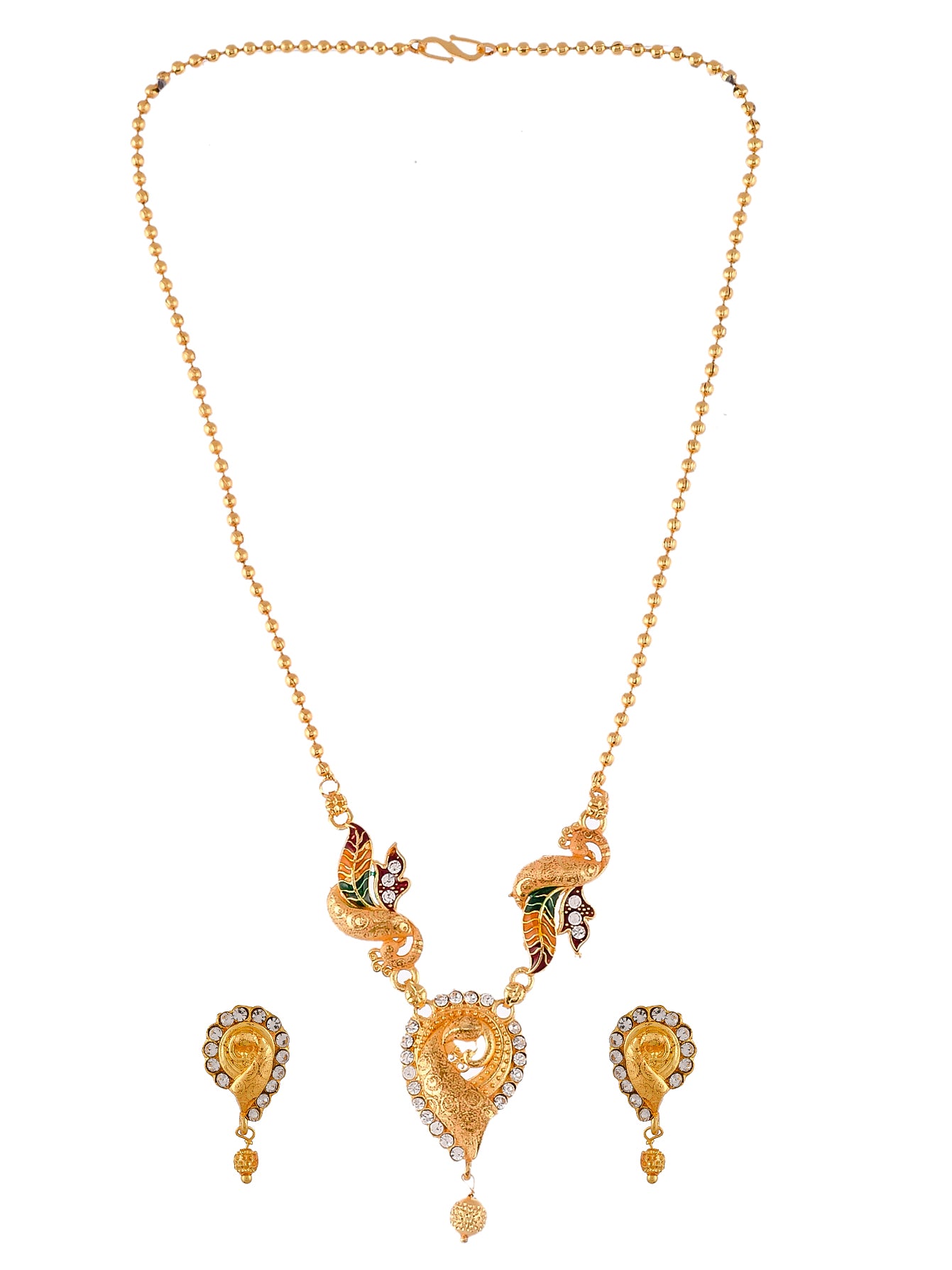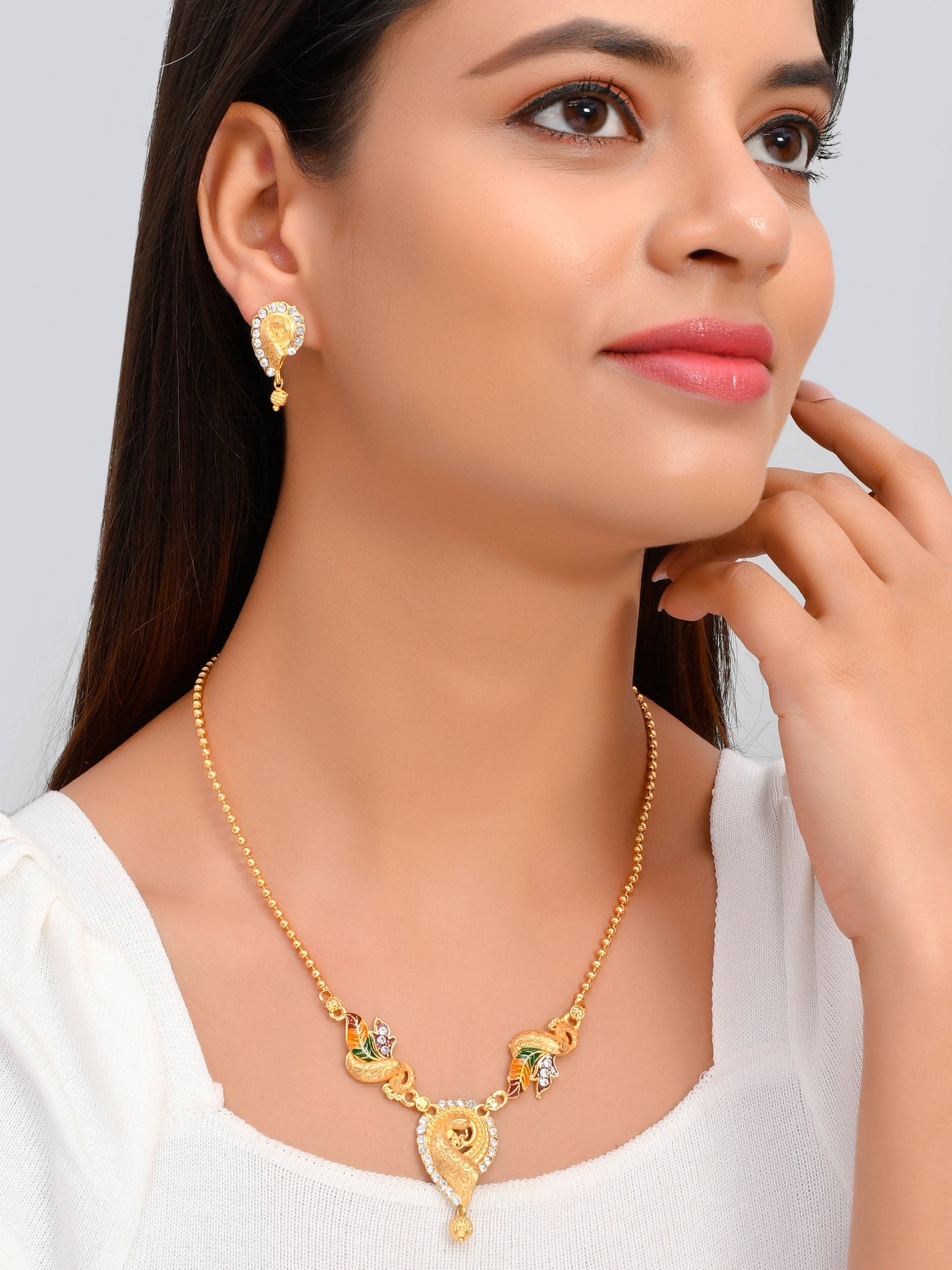 This beautiful Gold plated Mayuri Jewellery set is the perfect way to add a touch of luxury to any outfit. Crafted from quality materials and gold plated for a lustrous finish, this set is sure to turn heads.