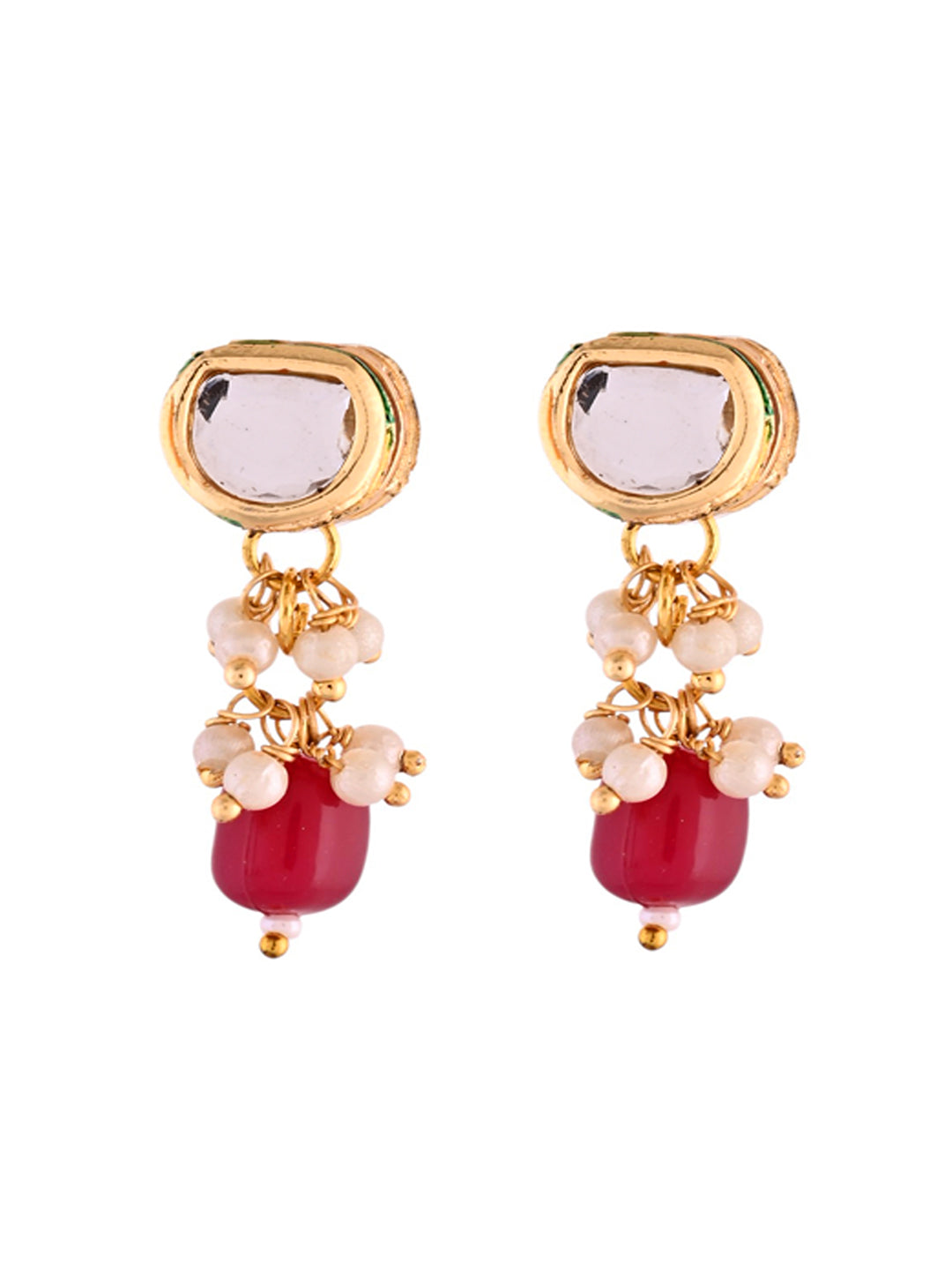The set includes matching earrings designed with Kundan stones, pearl embellishments, and red drop beads to complete the traditional look. Perfect for weddings, festivals, parties, haldi/mehendi functions, and special occasions.
