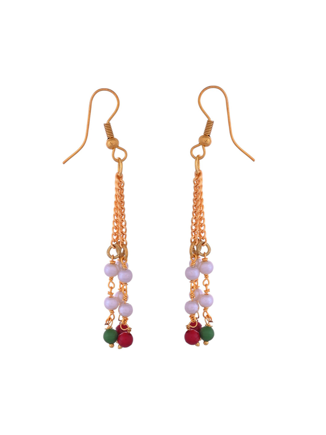 Bring timeless charm to your festive look with this stunning gold-plated pearl beaded necklace and earrings set. Designed with multiple layers of white pearls accented by red and green beads, this elegant jewellery captures the essence of traditional Indian craftsmanship.
