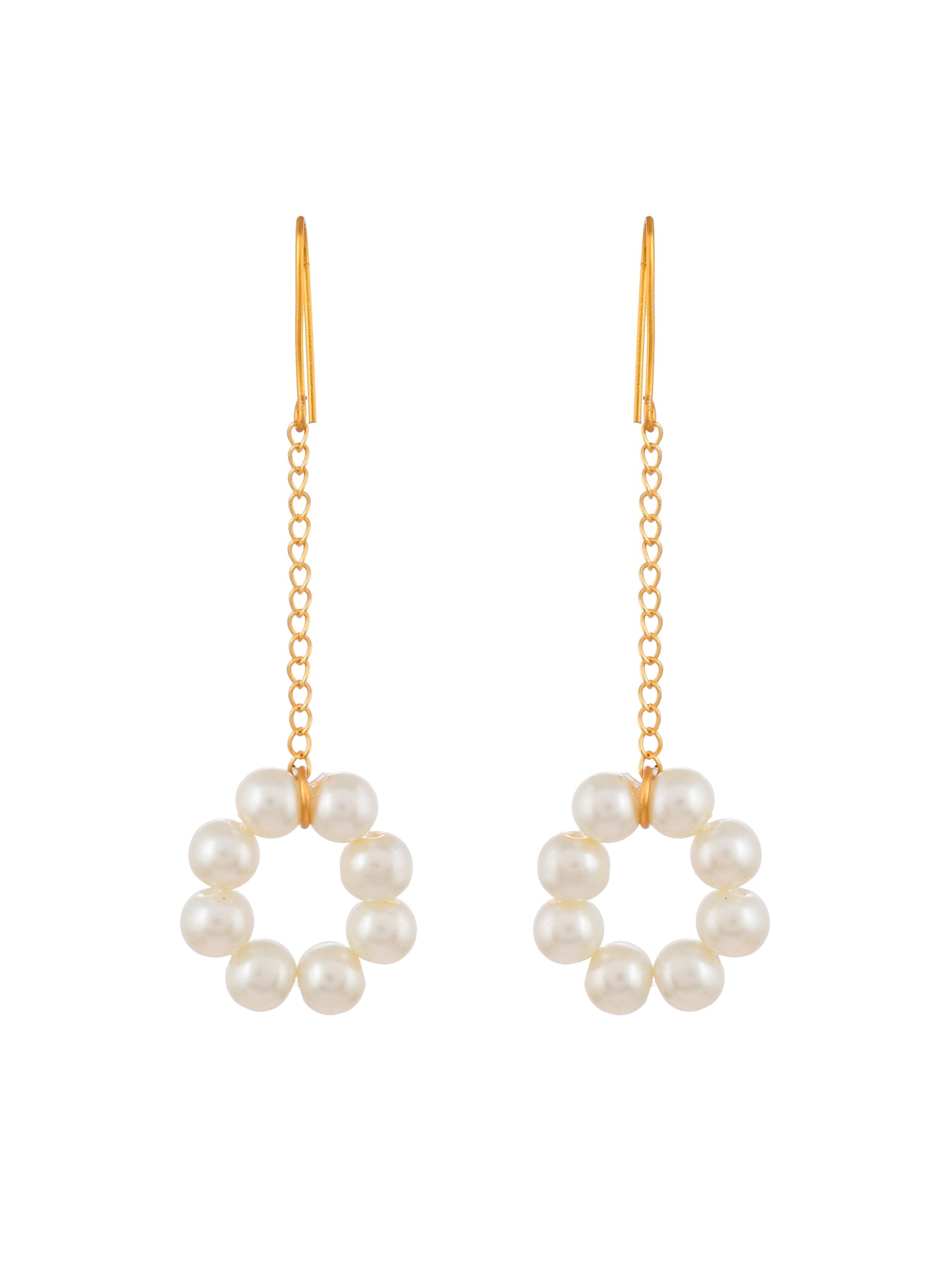 Shop These beautiful  Gold Plated Pearl Chain Drop Earrings feature a delicate gold-plated chain with pearl teardrops for a timeless look. The elegant design is perfect for any outfit, making them the ideal accessory for any occasion.