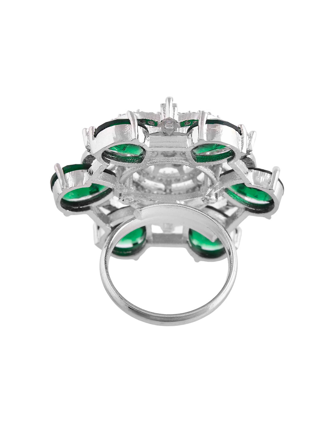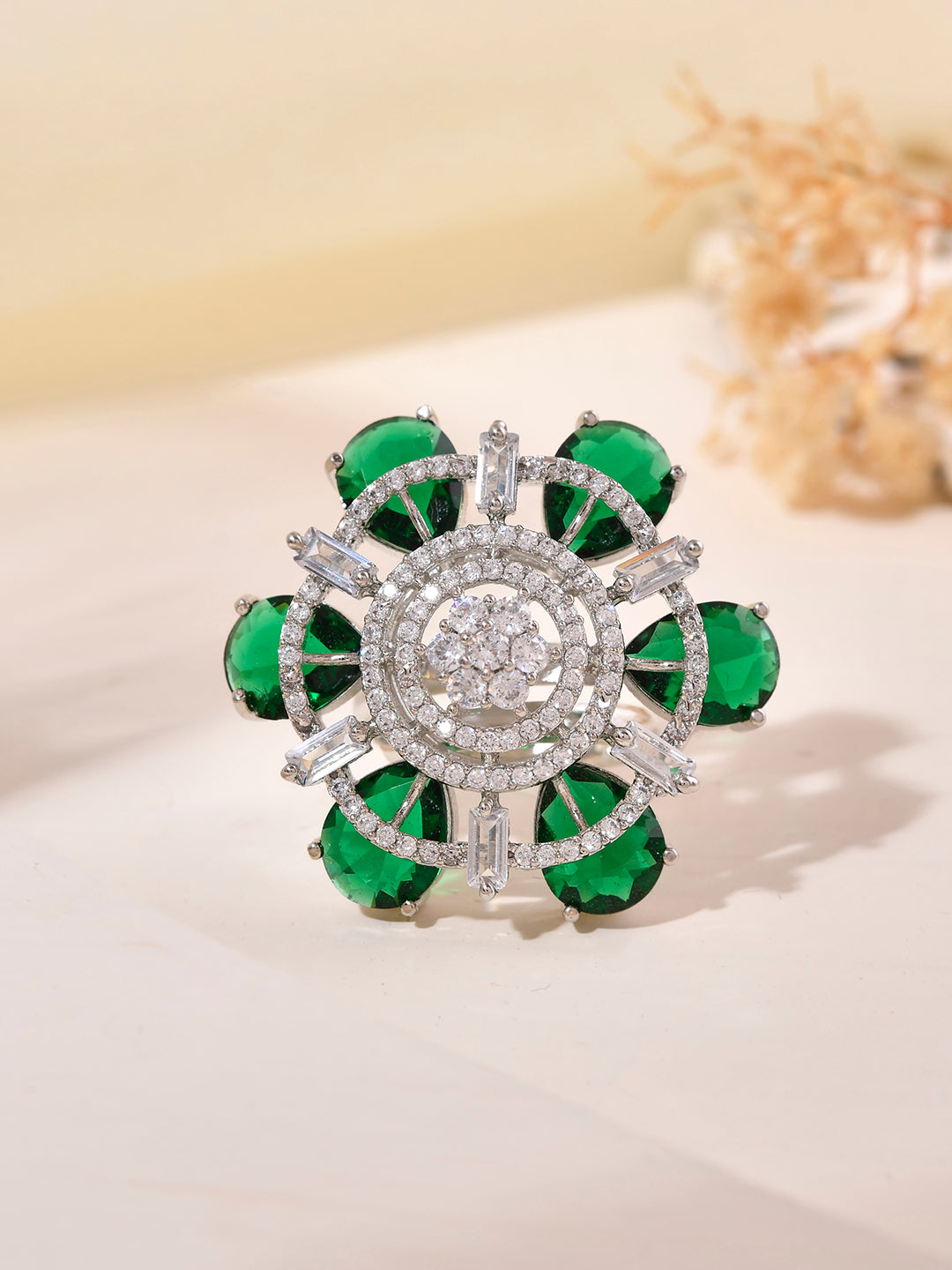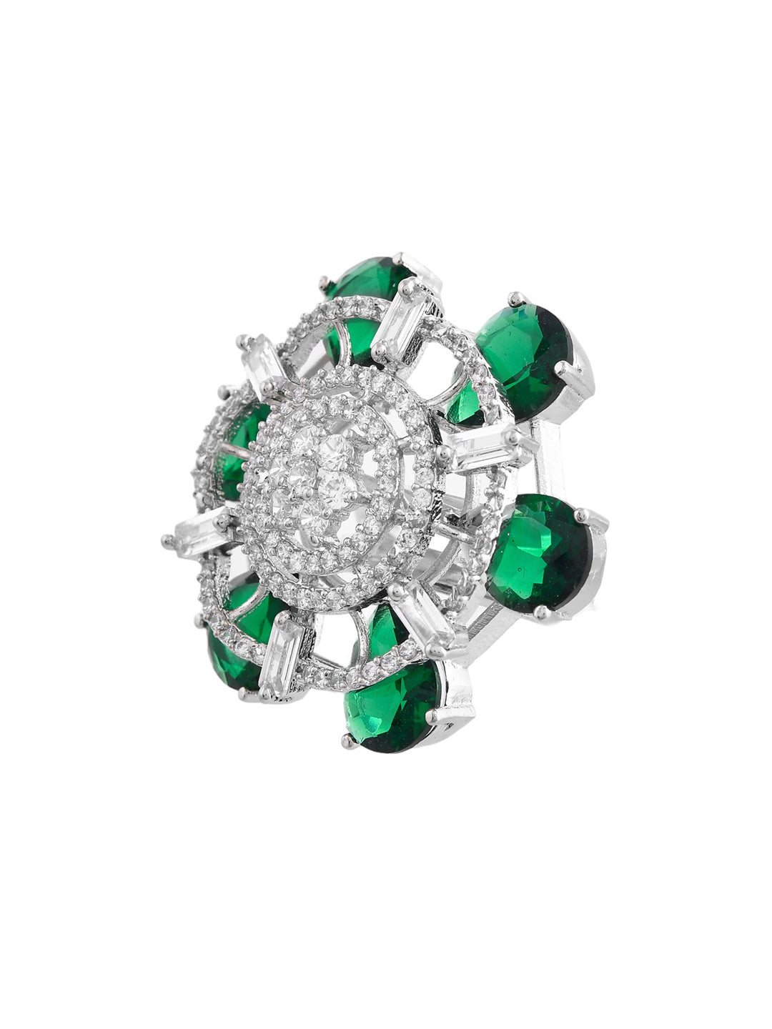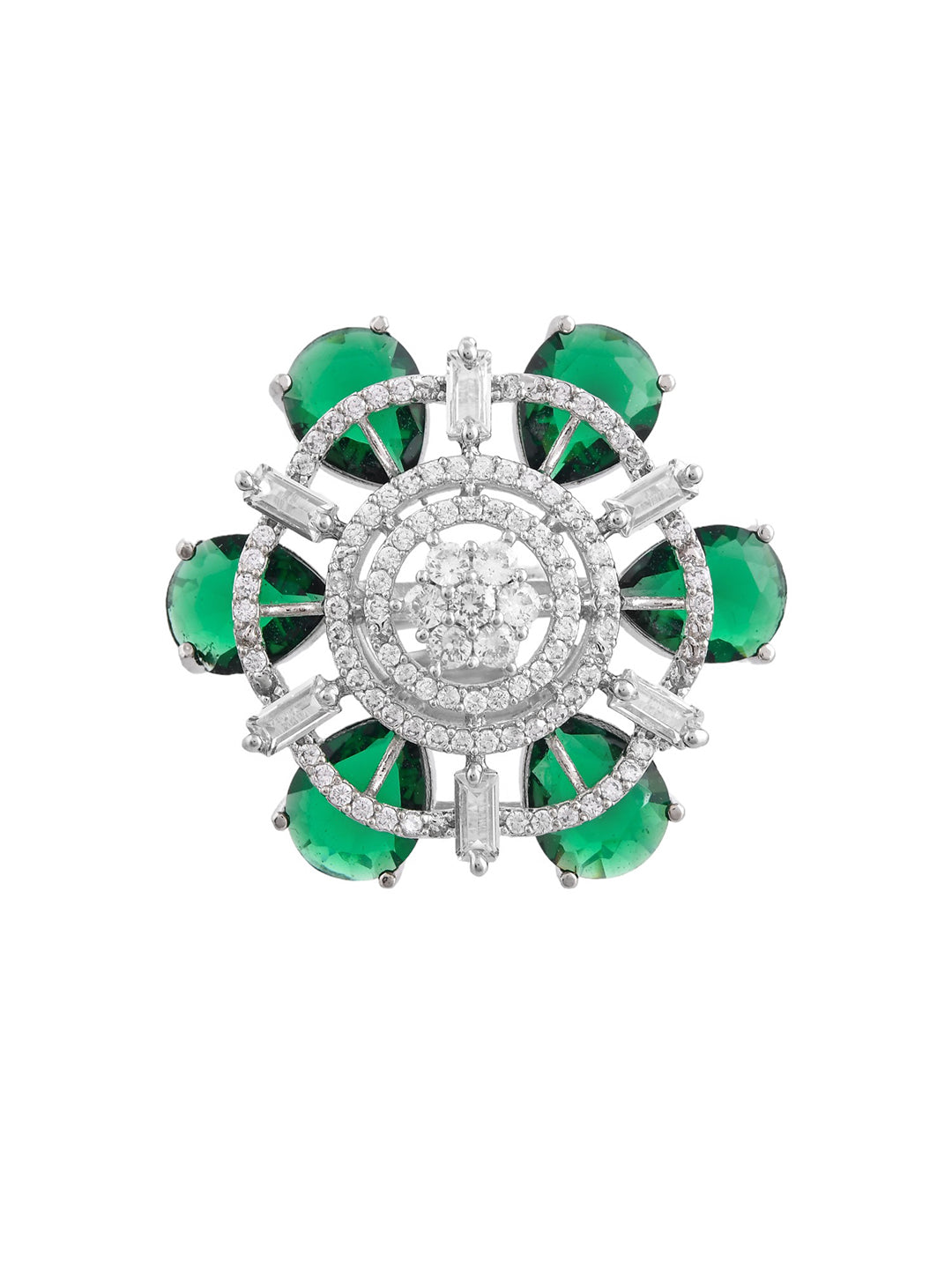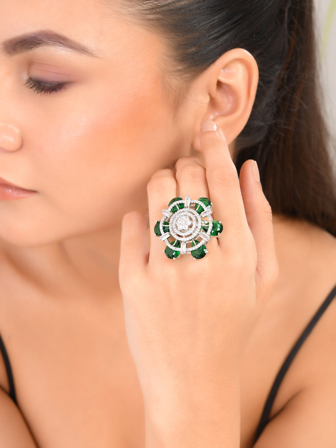 This exquisite floral finger ring for women features stunning green American diamond accents. Crafted with precision and attention to detail, this ring is sure to elevate any outfit. Made for the modern woman who appreciates timeless elegance and style. Perfect for adding a touch of sophistication to any ensemble.