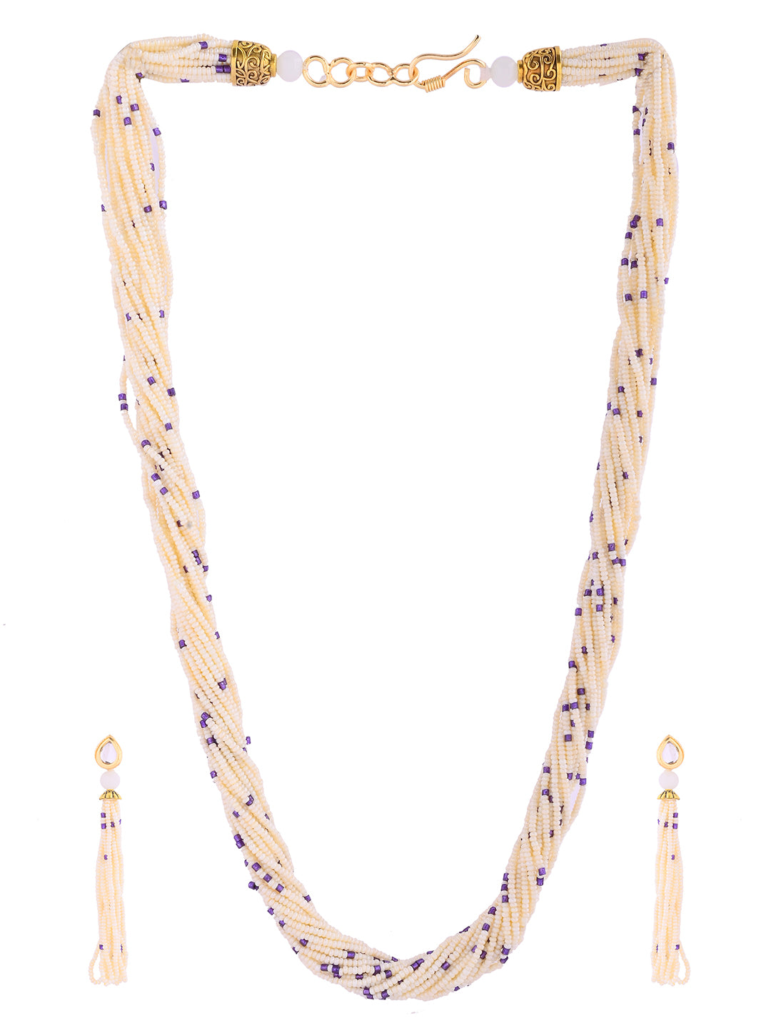 Ethnic style with this ivory multi-strand beaded necklace set, delicately accented with subtle blue beads for a refined contrast. Designed in a beautifully twisted layered pattern, this necklace reflects timeless elegance and handcrafted charm.