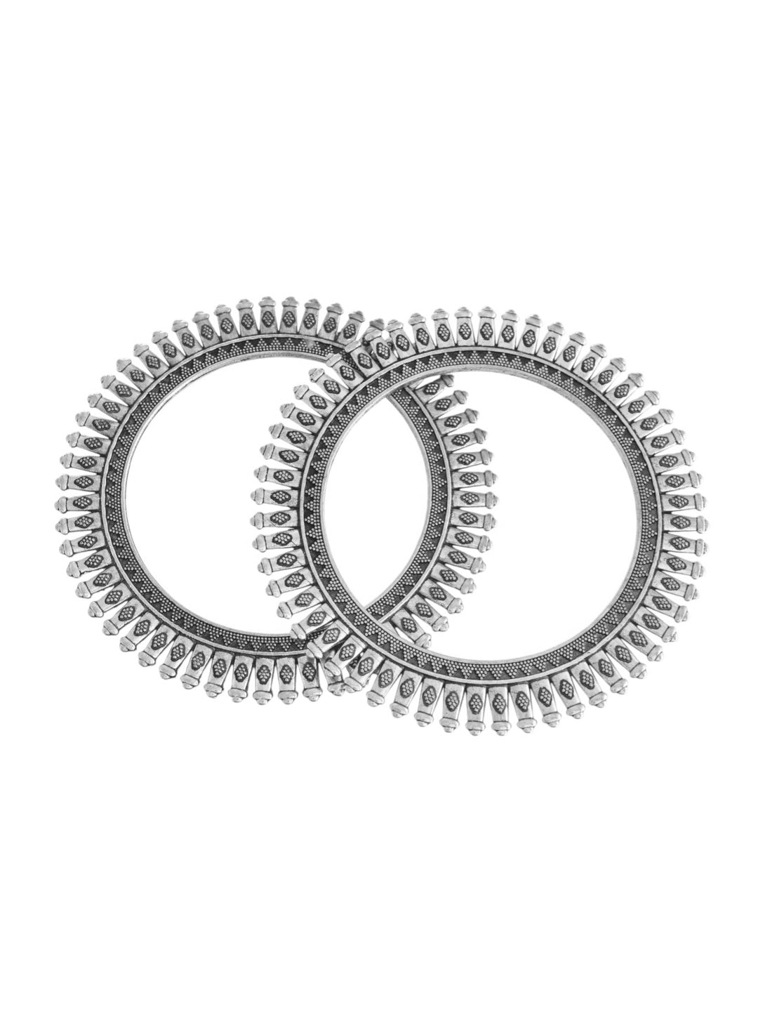 Make a bold traditional statement with this beautifully crafted oxidised silver bangle set inspired by classic temple jewellery motifs. Designed with intricate detailing and a unique fan-shaped border, these bangles blend heritage artistry with modern elegance. The antique silver finish adds a royal and timeless appeal, making them a perfect accessory for festive occasions, weddings, cultural events, or ethnic gatherings. Pair them with sarees, lehengas, or salwar suits to instantly elevate your traditional look.