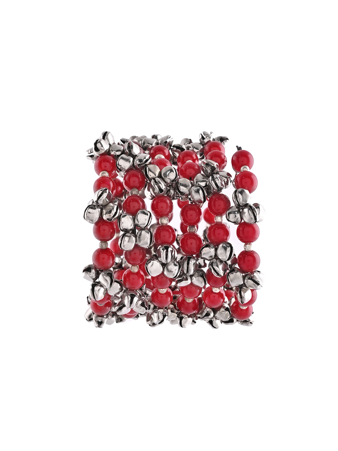 Make a bold statement with this handcrafted Red Beaded Ghungroo Bracelet, designed in a chunky multilayered style. The vibrant red beads paired with oxidised silver ghungroos give it a rich ethnic charm inspired by Rajasthani tribal jewellery. Perfect for festive looks, weddings, haldi-mehendi functions, and Indo-western outfits.