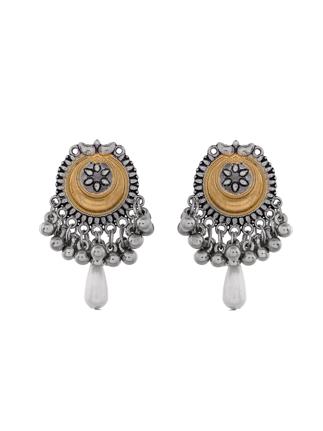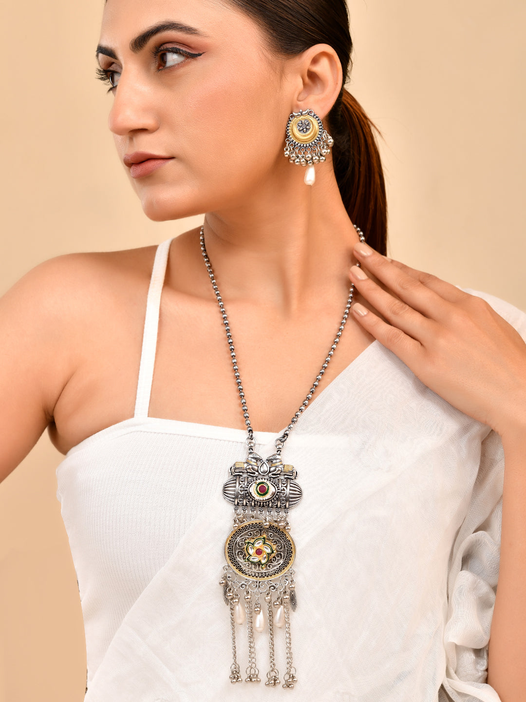 Enhance your ethnic look with this oxidised silver statement pendant necklace set featuring intricate tribal design and hanging bead detailing. Crafted with premium alloy and antique finish, this long necklace set offers a bold traditional appeal perfect for festive wear, casual ethnic styling, and cultural occasions. The artistic pendant and matching earrings create a unique boho statement look.